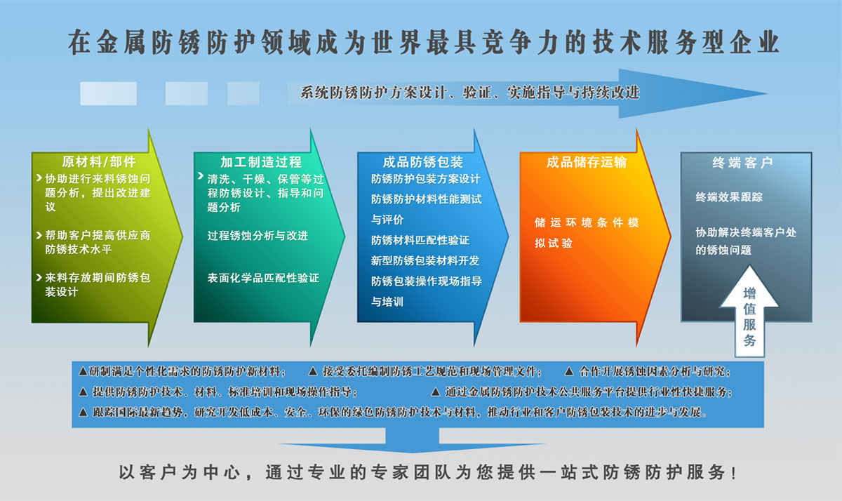通過一站式、標準化、差異化、增值化的服務來降低客戶的心理成本和使用成本,最終提高客戶的收益,使沈陽防銹服務“超越客戶期望,超越行業(yè)標準”,成為防銹業(yè)服務的旗艦品牌。